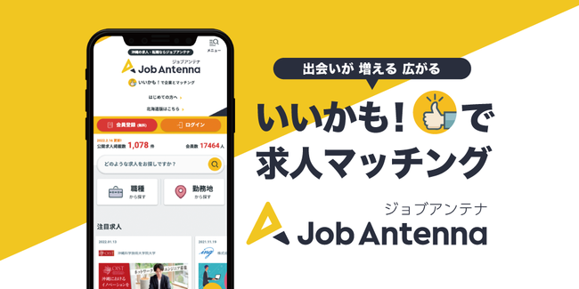 ジョブアンテナは、豊富な求人数と使いやすい検索機能を併せ持つ「地域特化型の求人マッチングサービス」として2016年より沖縄でサービスを開始しました。単に企業側から求人情報を発信するのではなく、企業と求職者がお互いに「いいかも!」というサインを送り合う機能が特徴的で、双方向かつ最適な採用・求職活動を実現しています。