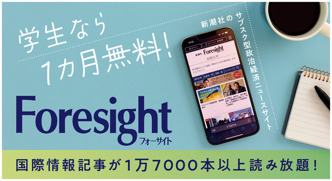 世界と日本の重要な政治経済ニュースが読める「フォーサイト」(運営・新潮社)が、「新しいことを学びたい」という意欲を持つ学生(※)の方を対象に、「『学び人』応援キャンペーン」を実施。新規入会の学生の方に限り、最初の1カ月間の購読が無料になります(月会費〔800円〕をクレジットカード払いの場合)
