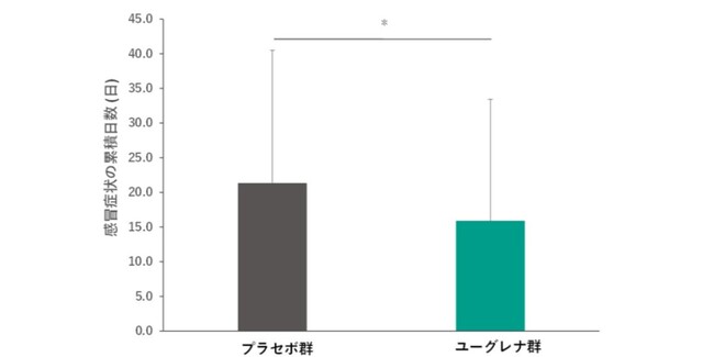 図1:ユーグレナの継続摂取による感冒症状(かぜ様症状)の累積日数への影響