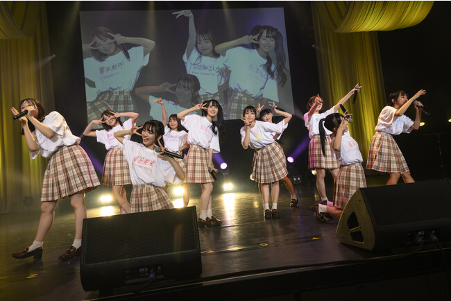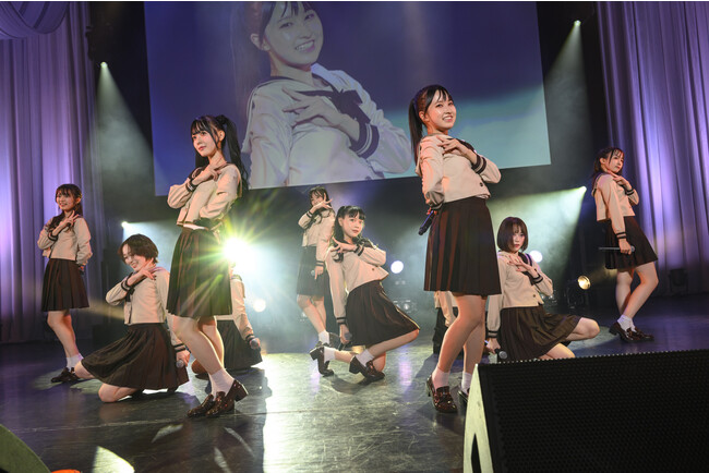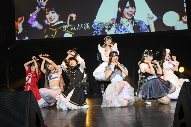 今回は声出しOKのライブとなり、MCではコールアンドレスポンスを聞くことができた。続いて、「大切な楽曲をカバーさせていただきます」という曲フリと共に、メンバーのうち3名が所属していたラストアイドルの「青春トレイン」「愛を知る」の2曲をカバー。「愛を知る」では、メンバーもペンライトを手に持ち会場をカラフルに彩った。