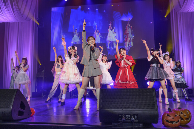 重厚な鐘の音に合わせてアーティスト写真がハロウィン仕様に。全体が暗転し、登場曲に合わせて客席からメンバーがそれぞれ自分で考えたハロウィン仮装衣装を身にまとい次々と登場。ステージに全メンバーが揃うと、AKB48の「ハロウィン・ナイト」のカバーパフォーマンスがスタート。「Are you ready?」の掛け声と共に元HKT48の村重杏奈も登場し、村重もパフォーマンスに加わりファンミーティングが華やかに幕を開けた。