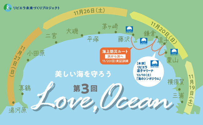 美しい海を守り"人と人"をつなぐ【LOVE OCEAN】を11/19~12/10に開催!相模湾を囲む神奈川沿岸13市町13海岸「リビエラ湘南ビーチクリーン」と「海のシンポジウム」で、海からの防災訓練も