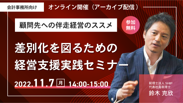 そこで、伴走型のコンサルティングで数々の成功実績をあげられている税理士法人SHIPの鈴木克欣先生をお招きし、企業と会計事務所が抱える課題のギャップや経営支援のケーススタディをご紹介します。