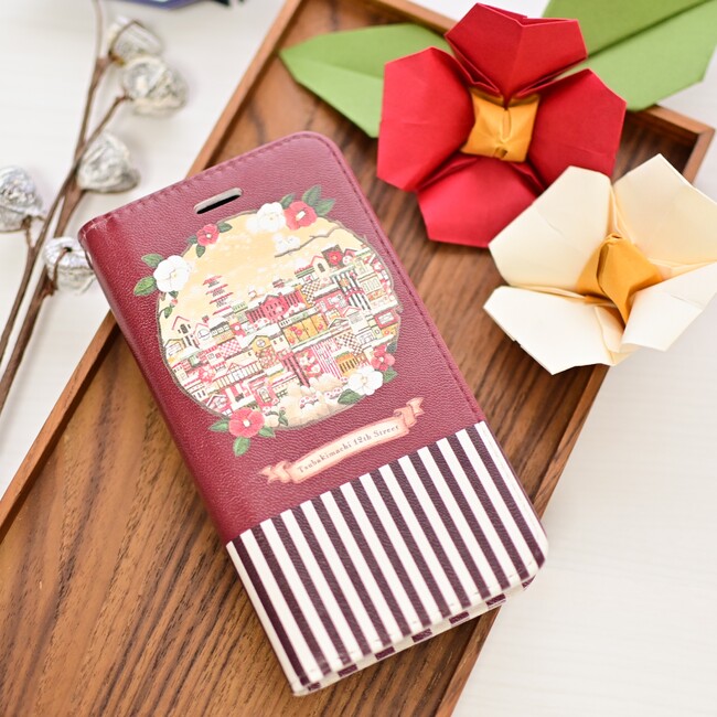 赤と白を基調とした椿の街の大正ロマン香るデザイン。和服にも似合うスマホケース。冬におすすめの一品です。