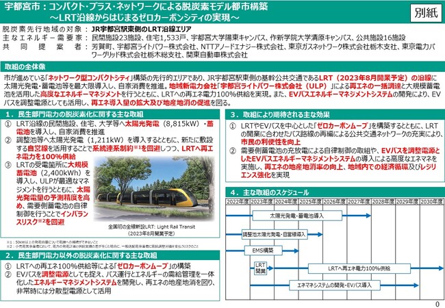 宇都宮市(市長:佐藤 栄一)、芳賀町(町長:見目 匡)、宇都宮ライトパワー株式会社(代表取締役:酒井 典久)、NTTアノードエナジー株式会社(代表取締役社長:岸本 照之)、東京ガスネットワーク株式会社栃木支社(支社長:清 幹広)、東京電力パワーグリッド株式会社栃木総支社(総支社長:瀬戸 晴彦)、及び関東自動車株式会社(代表取締役社長:吉田 元)の7者は、環境省が募集した第2回「脱炭素先行地域」に共同提案し、本日、「脱炭素先行地域」の一つとして選定されました。