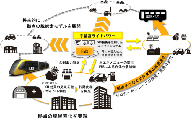 ・LRT沿線の公共・民間施設等に太陽光発電・蓄電池等を最大限導入するとともに、地域新電力会社(宇都宮ライトパワー株式会社)による再エネの一括調達と高度なエネルギーマネジメントを行い、民生部門(家庭部門及び業務その他部門)の電力消費に伴うCO2排出を2030年度までに実質ゼロとするものです。