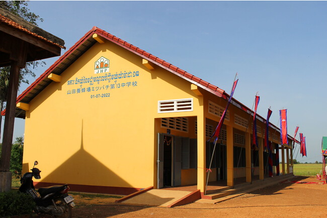 株式会社山田養蜂場(本社:岡山県苫田郡鏡野町、代表:山田英生、以下「山田養蜂場」)は、認定NPO法人 JHP・学校をつくる会(以下、JHP)の協力を得て、カンボジアのタナック中学校に、新たな校舎「山田養蜂場ミツバチ第13中学校」を寄贈しました。2022年11月1日(火)に現地で開催された寄贈式には、当社の取締役と従業員4名と、カンボジア王国の司法省長官や、学校関係者、JHP関係者など約500名が参加しました。