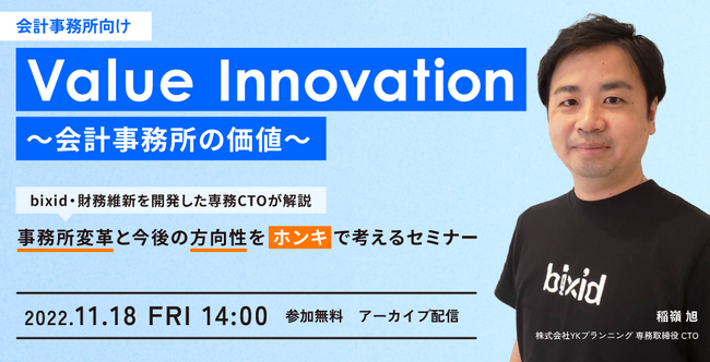 経営判断の“次の一手”を加速させる経営支援クラウド『bixid(ビサイド)』を提供する株式会社YKプランニング(本社:山口県防府市、代表取締役:岡本 辰徳)は、11月18日(金)に、会計事務所向けに「事務所変革と今後の方向性をホンキで考えるセミナー」をオンラインで配信いたします。