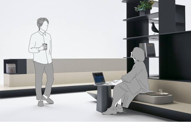 「ワークヴィラ」は、ソファやミーティングテーブル、シェルフなどで構成されたチームメンバーの溜まり場となるスペースと、溜まり場から外へつながる縁側を組み合わせたユニットです。ユニットを複数配置し、「溜まり場」「縁側」「小路」の組み合わせにより、さまざまなコミュニケーションを生み出すことが可能です。