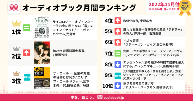 日本一のオーディオブック書籍ラインナップ数(※)を配信する「audiobook.jp」を運営する株式会社オトバンク( 本社:東京都文京区、代表取締役社長:久保田裕也、以下「オトバンク」)は、当社が運営する会員数が250万人を突破した日本最大級のオーディオブック配信サービス「audiobook.jp」におけるオーディオブック月間ランキング11月付(2022/10/1~10/31)を発表します。