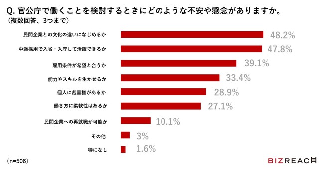 さらに、官公庁で働く魅力については、「仕事を通じて社会貢献ができる(64.8%)」「官公庁でしかできない、インパクトの大きな仕事に関われる(55.1%)」「さまざまな人脈や情報にアクセスできる(45.3%)」が多く挙げられました。一方、働くことを検討するうえでの不安点については、「民間企業との文化の違いになじめるか(48.2%)」「中途採用で入省・入庁して活躍できるか(47.8%)」などが挙げられています。