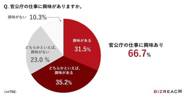 その結果、ビズリーチ会員の66.7%が「官公庁の仕事に興味がある」と回答しました。昨年実施した同様のアンケートと比べると「興味がある」と回答した方が、前回の21.7%から今回は31.5%と約10ポイント増えており※2、ビジネスパーソンの官公庁の仕事への興味が以前より高まっていることがうかがえます。