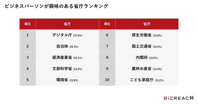 興味のある省庁の上位に「デジタル庁」「自治体」「経済産業省」