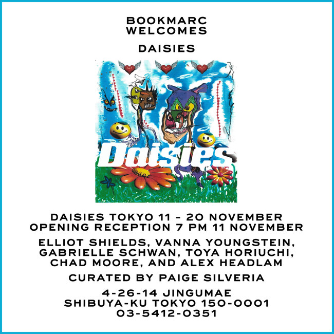 ニューヨーク発ファッションブランド「マーク ジェイコブス」が手掛けるブックストア「BOOKMARC(ブックマーク)」にて、Paige Silveriaのキュレーションによるコラボレーション・アート・プロジェクト『Daisies』の東京でのグループ展を開催します。日本初上陸となる本展は、幡ヶ谷gallery communeとの協働で、Alex Headlam, Gabriel Schwan, Toya Horiuchi, Elliot Shields, Vanna Youngstein, Chad Moore、6人の国際的アーティストによるマルチメディア作品を一挙公開致します。オープニング・レセプションでは、Alex Headlam, Gabriel Schwan, Toya Horiuchi, Elliot Shields,そしてキュレーターのPaige Silveriaが来日しサイン会も開催。皆様のご来店お待ちしております。