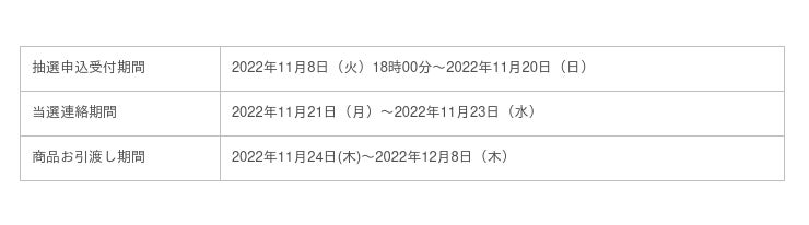 ※商品お渡し期間に、代金のご精算および商品のお渡しができない当選者様は当選権を無効とさせていただきます。