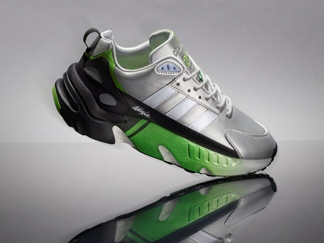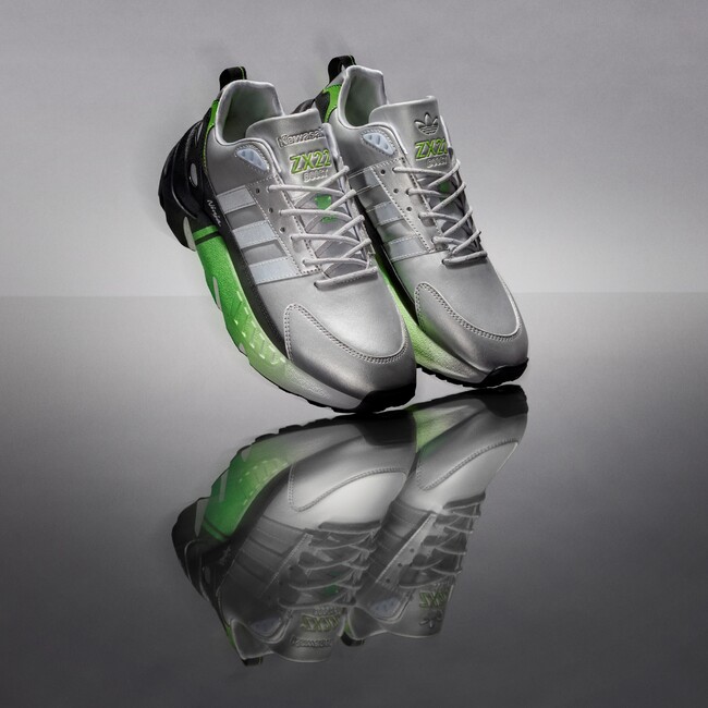 この第二弾「ZX22 KAWASAKI」の未来的なデザインは、カワサキの美学をZXスニーカーの世界と融合。大胆なメタリックカラーをメインに、ブラックとライムグリーンでアクセントが施されています。