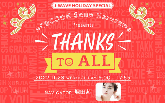 ラジオ局J-WAVE(81.3FM)では、11月23日(水・祝)9:00~17:55、豪華出演者とナビゲーターでお届けする9時間のホリデースペシャル『J-WAVE HOLIDAY SPECIAL ACeCOOK Soup Harusame presents THANKS TO ALL』を放送いたします。