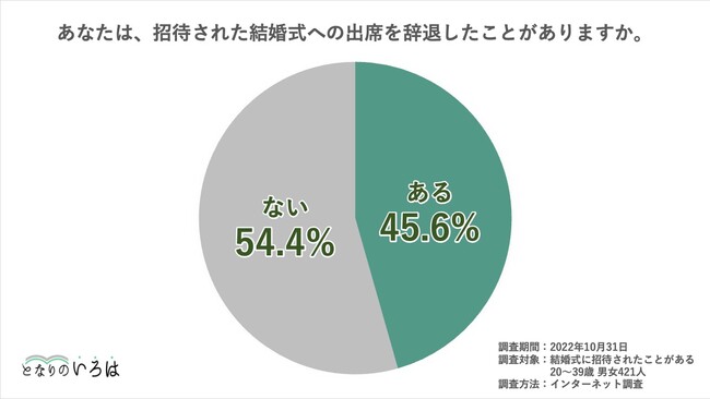 まず結婚式への出席を辞退した経験の有無を尋ねたところ、出席を断ったことが「ある」と回答した人は約半数(45.6%)となりました。年代別で見ると30代は20代より断ったことがある経験が多く(20代:41.9%、30代:47.9%)、年齢を重ねるにしたがって招待される回数が増え、出席を断る回数も増えているものと推測されます。