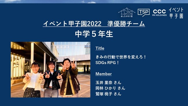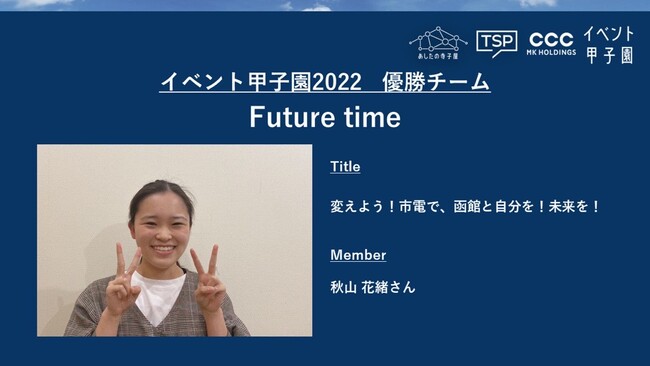 株式会社あしたの寺子屋(本社:北海道札幌市、代表取締役社長:嶋本勇介)、TSP太陽株式会社(本社:東京目黒区、代表取締役社長:池澤嘉悟)、CCCMKホールディングス株式会社(本社:東京渋谷区、代表取締役社長:高橋誉則、以下「CCCMKHD」)の3社は、三菱みらい育成財団助成採択事業として、高校生が自分のワクワクをイベントとしてカタチにする「イベント甲子園2022」を初めて開催しました。2022年10月16日(日)にオンラインでのプレゼンテーション審査を行い、優勝・準優勝の2団体が決定いたしましたので、お知らせいたします。優勝は、Future Time(北海道函館市)の「変えよう!市電で、函館と自分を!未来を!」で、 コロナ禍で薄れてしまった「対面でのコミュニケーションの楽しさ」を再創出するイベントを提案しました。準優勝は、中学5年生(北海道札幌市)の「きみの行動で世界を変えろ!SDGs RPG!」で、「SDGsを知っている」から「SDGsは自分事」という認識を作るイベントとなりました。この2団体は、獲得した活動支援金(優勝100万円、準優勝50万円)を元に、2023年1月以降のイベント実現に向けて取り組んでまいります。