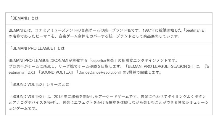 コナミアミューズメントは、『BEMANI PRO LEAGUE』を通じて、新たなユーザー体験を提供することで、参加しても観戦しても楽しい、KONAMIタイトルの「面白い」・「楽しい」をより多くのお客さまにお届けしていきます。