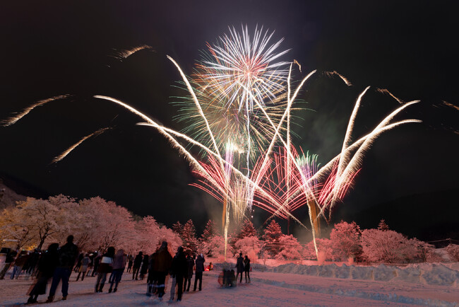寒空に輝く美しい月や、満天の星を背景に上演する、音楽とシンクロした花火ショー。澄み切った冬の空気だからこそ、格段に色鮮やかな花火を楽しむことができます。
