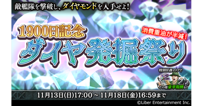 さらに、11月13日(日)17:00~11月18日(金)16:59までの間、ゲーム内アイテム「ダイヤモンド」を入手できるイベント「1900日記念 ダイヤ発掘祭り」を開催します。ダイヤモンドはゲーム内で★5確定のダイヤモンドサルベージに使用できるアイテムとなりますので、ぜひお楽しみください。