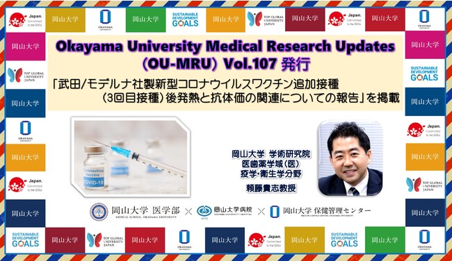 本号では、学術研究院医歯薬学域(医)疫学・衛生学分野の頼藤貴志教授、松本尚美昌助教、岡山大学病院総合内科・総合診療科の萩谷英大准教授、岡山大学保健管理センターの樋口千草助教の共同研究グループの「武田/モデルナ社製新型コロナウイルスワクチン追加接種(3回目接種)後発熱と抗体価の関連についての報告」の研究成果を紹介しています。