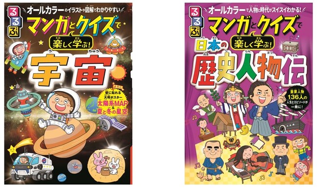 「るるぶ」ならではの編集ノウハウを活かした、わかりやすいイラストや図解を使い、「宇宙の誕生や太陽系の惑星」、「日本史の重要人物136人の人生やエピソード」について、オールカラーで子どもたちにもわかりやすくマンガで解説しています。また復習クイズやコラムなど、より深く理解し、楽しく学べる工夫も満載です。