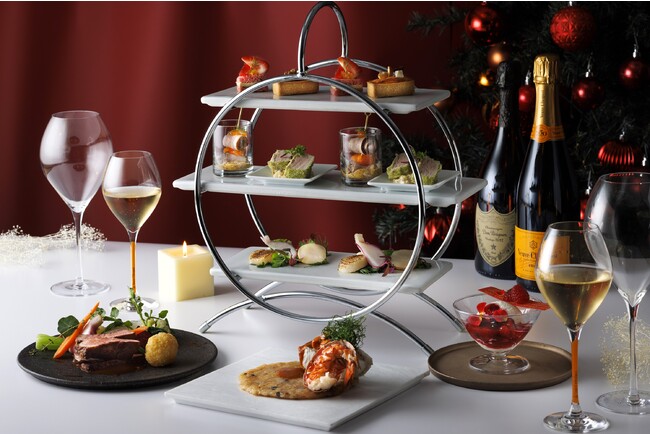ホテル最上階「Bar19(バーナインティーン)」では、聖夜を彩るハイティーに、白と赤の2色のクリスマスカラーをお料理やカクテルに用いました。ドン・ペリニヨンの乾杯にはじまり、シャンパン ヴーヴ・クリコとのマリアージュを楽しむセイボリーには、スタンドに帆立貝柱のマリネやオーブンで焼いた鴨肉、本鮪をレアに揚げたフリットなど白と赤のコントラストに彩られた5種を。メインは、国産牛フィレ肉とフォアグラのソテーをご用意いたします。