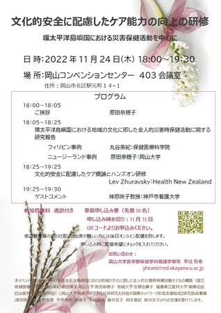 【岡山大学】文化的安全に配慮したケア能力の向上の研修 環太平洋島嶼国における災害保健活動を中心に〔11/24木, 岡山コンベンションセンター〕