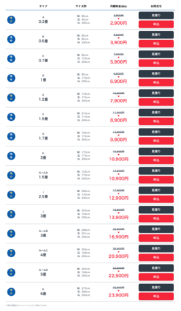 部屋タイプとサイズ、月額料金はこちら