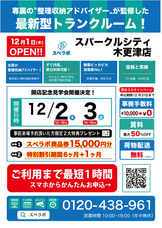 【12月1日(木)オープン】見学から契約、解約まで完全非接触・非対面、お申し込みからご利用まで最短1時間!絶賛運営中のトランクルーム【スペラボ】が木更津駅スパークルシティ木更津内に出店!