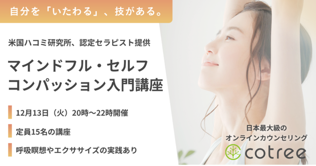 オンラインカウンセリング・コーチングの「cotree」を展開する株式会社cotree(本社:東京都港区、代表取締役:西岡 恵子、以下cotree)は、2022年12月13日(火)に「マインドフル・セルフ・コンパッション入門講座」を開催することをお知らせいたします。
