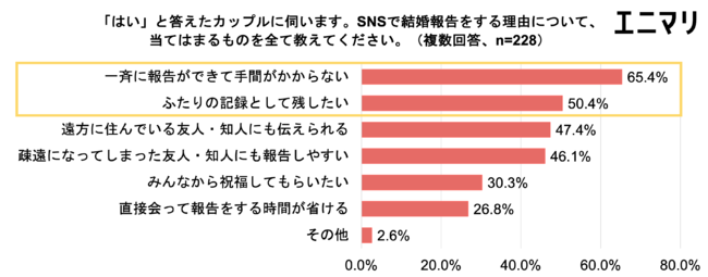 SNSで結婚報告をする理由は、「一斉に報告ができて手間がかからない」「ふたりの記録として残したい」
