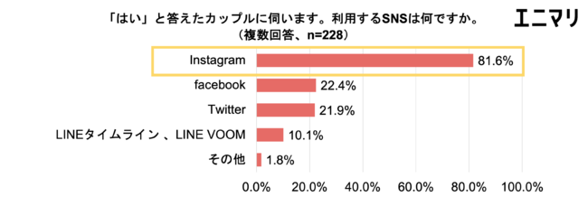 結婚報告についてたずねたところ、7割超のカップルがSNSで結婚報告をすることがわかりました。そのうちインスタグラムを利用して報告をするカップルは81.6%で圧倒的に多く、次いでフェイスブック22.4%、ツイッター21.9%が続きました。インスタグラムはSNSの中でも写真の投稿や閲覧に特化しているため、結婚報告で利用するカップルが多い模様です。