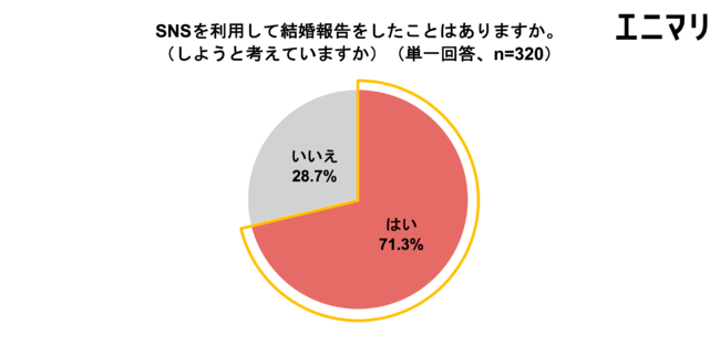 くふうカンパニーグループにおいて、結婚を「新しいカタチ」でお祝いしあえるサービス・メディアを展開する株式会社エニマリ( 以下「エニマリ」)は、運営するウェディングの総合情報サイト『みんなのウェディング』において、「結婚報告を終えた花嫁さん」や「これから結婚報告を予定している花嫁さん」を対象に結婚報告に関するアンケートを実施しました。アンケート結果によると、7割超のカップルがSNSで結婚報告をすると回答し、ふたりの写真と共に手軽に一斉報告ができるSNSを上手く活用していることが分かりました。