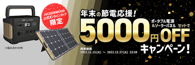 株式会社JVCケンウッドは、公式オンラインストア「JVCケンウッドストア」にて、昨今の電力ひっ迫による節電対策や災害対策などに役立つ「年末の節電応援!ポータブル電源&ポータブルソーラーパネル、セットで5,000円OFFキャンペーン!」を本日より実施します。キャンペーン対象期間は、2022年11月15日(火)~2022年12月27日(火) 23:59です。