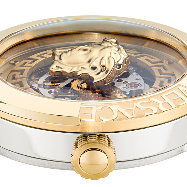 『MEDUSA INFINITE SKELETON(メドゥーサ インフィニット スケルトン)』は、ブランドアイコンの「フローティングメドゥーサ」と、シンボリックモチーフであるグレカ模様を立体的にデザインした機械式時計です。