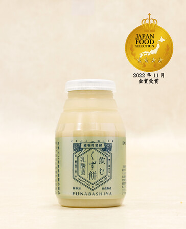 船橋屋の看板商品であるくず餅は江戸から続く和菓子唯一の発酵食品。飲むくず餅乳酸菌はくず餅の発酵槽の中から発見した”くず餅乳酸菌(R)”を使った身体にやさしいドリンクです。身体にやさしいものをそのままお届けしたいという想いから原料はお米と水・くず餅乳酸菌のみ。砂糖不使用、保存料不使用でお届けします。ほんのり香る甘さはお米のでんぷんが分解されたもの。ボトル内でくず餅乳酸菌が発酵し、アミノ酸など494種の成分を作り出すことで完成します。程よい甘み加減と発酵加減で、熱処理により発酵を止めてボトリングしました。