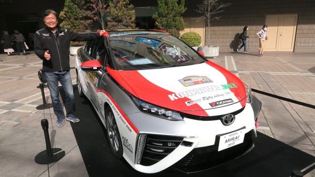 展示車中、唯一のレーシングカーはMIRAI国沢号。日曜朝には、国沢光宏さんご本人が来場。ファンからサイン攻めでした。