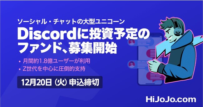 HiJoJo Partners株式会社は、ソーシャル・チャット・プラットフォームのユニコーン企業「Discord」に投資予定のファンドを2022年11月21日(月)に募集を開始します。このファンドは、HiJoJo Partnersが販売するインターネット販売の個人投資家向けファンドシリーズ「HiJoJoユニコーンファンド」の第5弾ファンドとなります。