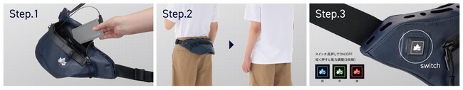 使い方は、市販のモバイルバッテリーをセットし、腰部に着用して衣服を被せ、スイッチを長押しするだけとシンプルです。スイッチを短く押すと風力を調整することもできるので、場所や気温に応じて風量を選択可能です。また、保管や持ち運びに便利な収納ポーチも付属します。