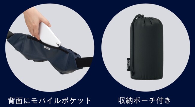 背面にはモバイルバッテリーを入れられるポケット付きのほか、保管する際に便利な収納ポーチも付属。