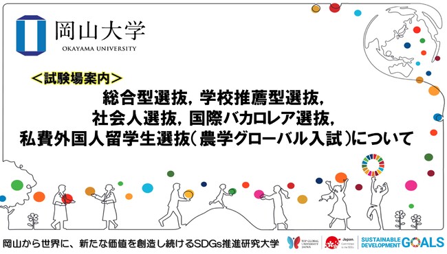 国立大学法人岡山大学(本部:岡山市北区津島中、学長:槇野博史)では、総合型選抜(大学入学共通テストを課すもの)、学校推薦型選抜I・II、社会人選抜、国際バカロレア選抜【10月募集】、私費外国人留学生選抜(農学グローバル入試)の試験場、試験場までの経路について掲載しましたので、お知らせします。