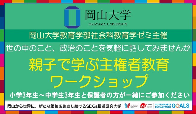 国立大学法人岡山大学(本部:岡山市北区、学長:槇野博史)の教育学部桑原敏典研究室では、2022年11月27日(日)に、岡山市立北公民館で親子で学ぶ主権者教育ワークショップを大学院生が開催します。