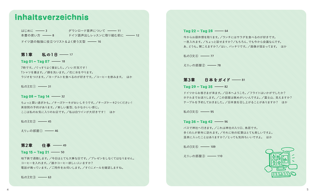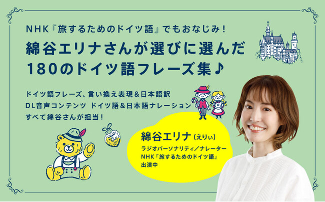 ドイツで生まれ育ち、現在は日本でラジオパーソナリティ/ナレーターとして活躍中の綿谷エリナさんが180のフレーズと日本語訳、コラムを執筆。また、NHK「旅するためのドイツ語」ナレーションで定評のあるさわやかな声でドイツ語、日本語両言語のナレーターを担当しました。