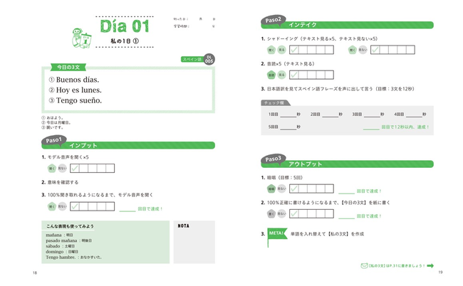 何度も聞いて声を出す「声出しメソッド」。スペイン語の音からフレーズを覚えていくので、文法知識がなくても取り組めます。