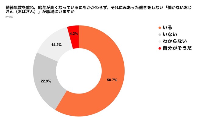 回答者のうち、無職、個人事業主・自営業、学生をのぞいた雇用労働者767人を対象に、職場に「働かないおじさん(おばさん)」がいるかどうかを尋ねたところ、58.7%が「いる」と回答。「自分がそうだ」という回答も4.2%あり、合計では6割を超えています。