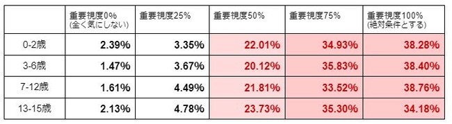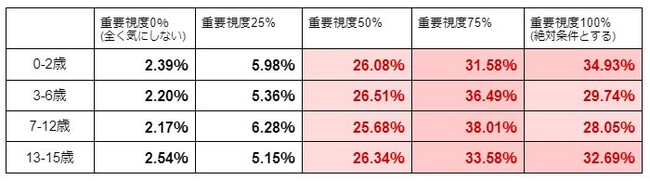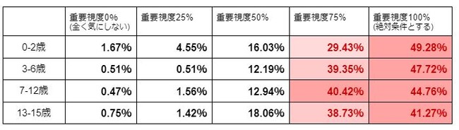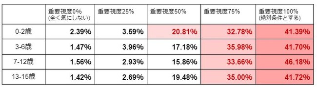 「子どもの記憶に残る体験かどうか」という観点については、全年齢において、重要視度75%をする家庭が3割以上、重要視度100%(絶対条件)とする家庭が4割以上となりました。