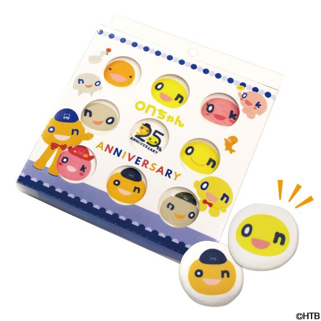 HTB北海道テレビのマスコットキャラクターonちゃんの25周年誕生会記念のお菓子2種が登場!onちゃん、okちゃん、noちゃんと、着ぐるみonちゃんが一緒に25周年をお祝いするかわいらしいイラストは、このお菓子のために特別に描きおこしされた限定デザインです。